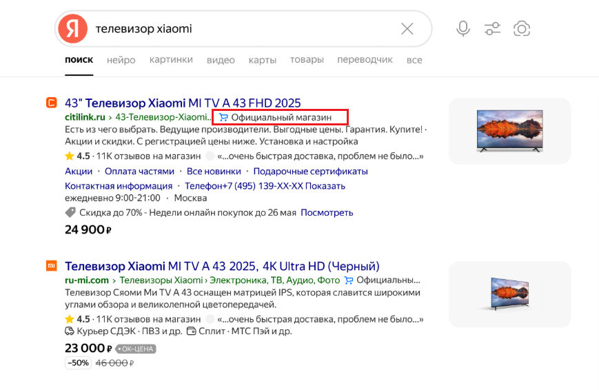 Значок «Официальный магазин бренда» может отобразиться в органических результатах поисковой выдачи: