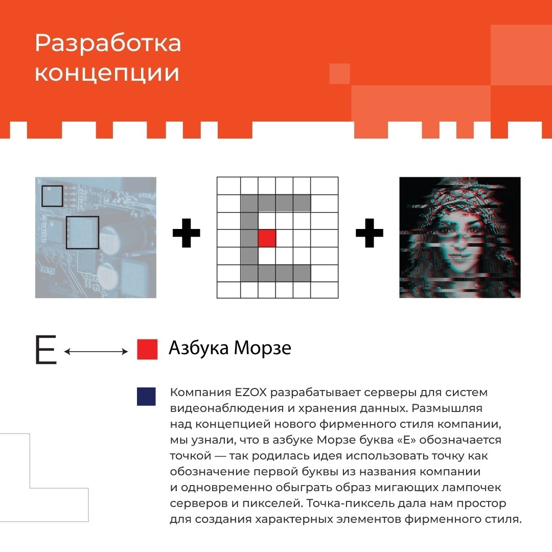 Размышляя над концепцией нового фирменного стиля компании, мы узнали, что в азбуке Морзе буква «Е» обозначается точкой. Так родилась идея использовать точку как обозначение первой буквы из названия компании и одновременно обыграть образ мигающих лампочек серверов и пикселей. В итоге точка-пиксель стала характерным элементом фирменного стиля.
